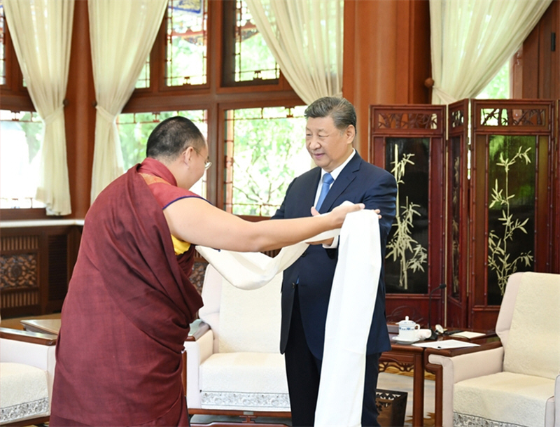 6月6日,中共中央总书记、国家主席、中央军委主席习近平在北京中南海接受班禅额尔德尼·确吉杰布拜见。这是班禅向习近平敬献哈达。